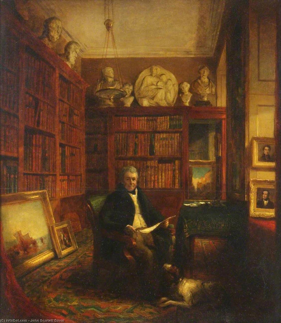 En vraiiii… C’est une œuvre intitulée « The Library » de John Scarlett Davis (1804–1845), un Britannique dont la spécialité est de peindre des tableaux de tableaux, notamment des galeries d’art ou des intérieurs de musée. (C’est pratique pour garder un souvenir au cas où les collections seraient détruites par un incendie). Cette huile sur toile a été peinte en 1830 mais l’homme qui y apparaît n’est pas nommé (ni le chien hélas). Elle appartient actuellement au Herefordshire Museums & Galleries.